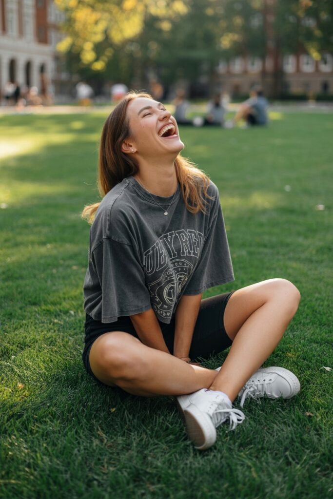This is the ultimate lazy-day outfit that somehow still looks cool. Grab your favorite oversized graphic tee (bonus points if it’s thrifted or vintage-inspired) and pair it with black biker shorts. It’s simple, comfy, and gives that “effortlessly trendy” look — especially when paired with clean white sneakers and simple accessories.