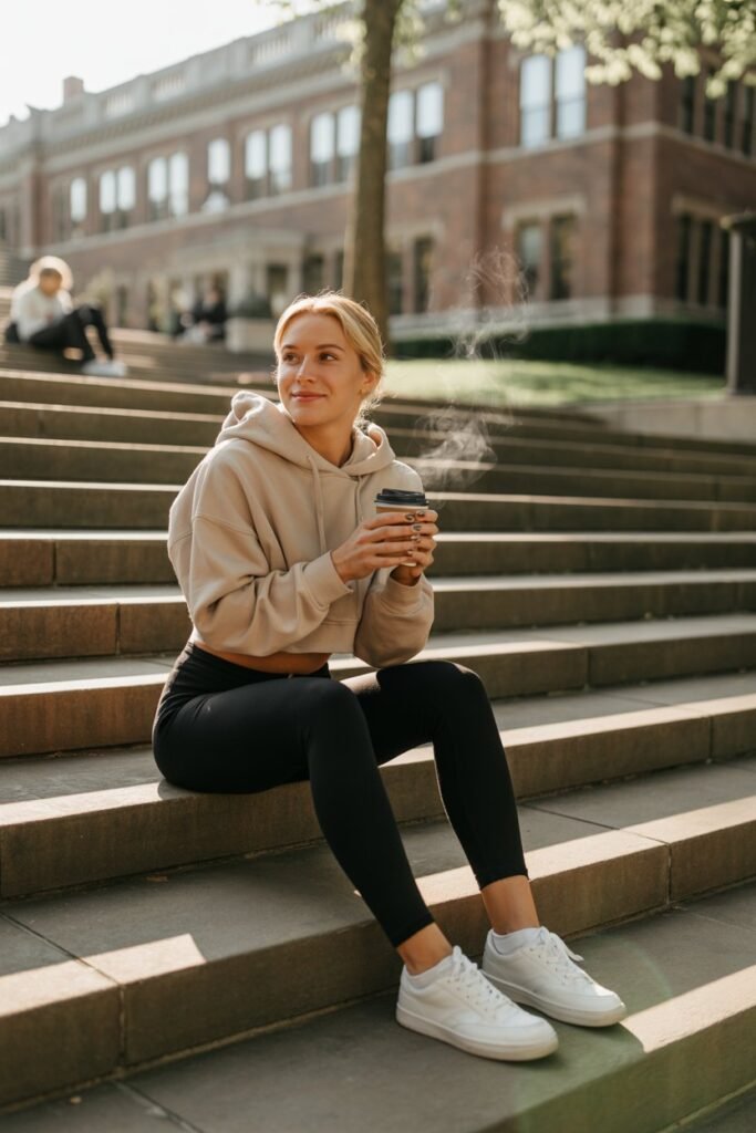 Nothing says “college comfort” like leggings and a cropped hoodie. This combo is your go-to for chilly mornings or lazy days when you still want to look put together. The hoodie adds warmth while the leggings keep everything sleek and flattering.