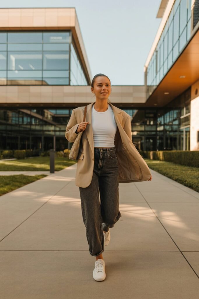 Who says blazers are only for business meetings? Pair an oversized blazer with a simple white tank and high-waisted jeans, and suddenly you’ve got an outfit that looks smart, confident, and totally fashion-forward. Perfect for when you want to look like you have your life together (even if you’re still running on iced coffee and vibes).