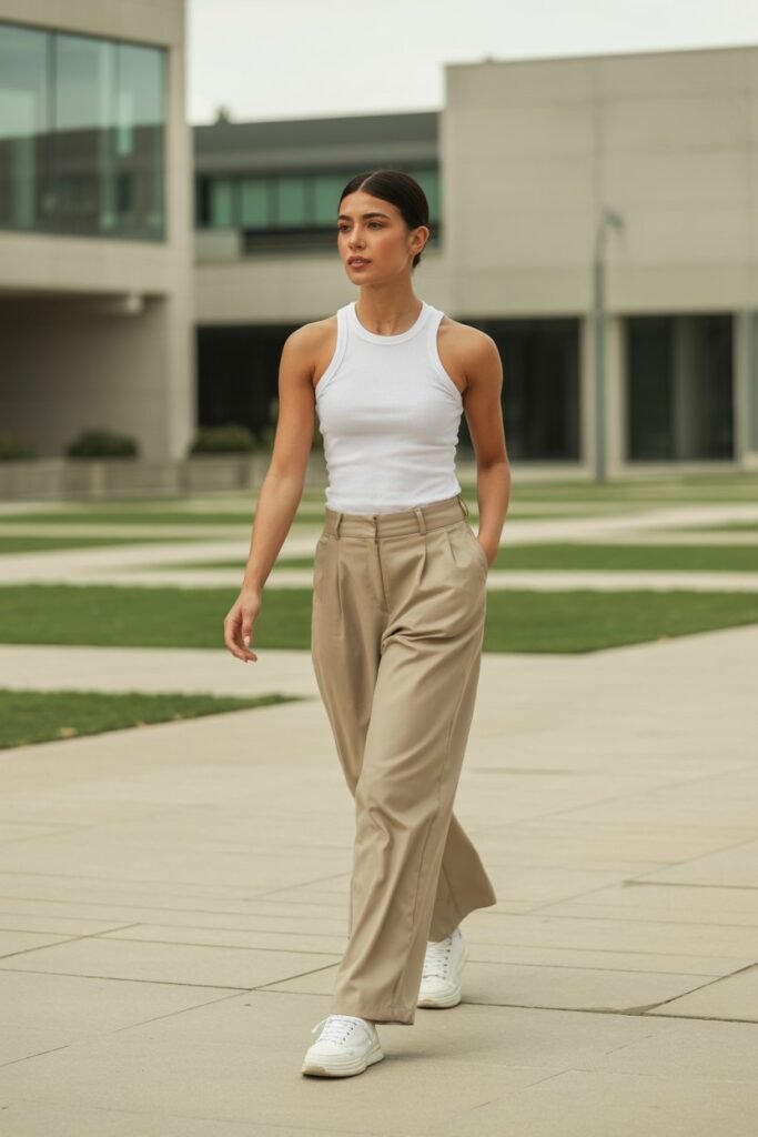 Pair beige wide-leg trousers with a white fitted tank or bodysuit, and you’ve got a fit that works for both class and coffee dates. Add your white sneakers, slick-back bun, and simple gold hoops for the ultimate elevated everyday vibe.