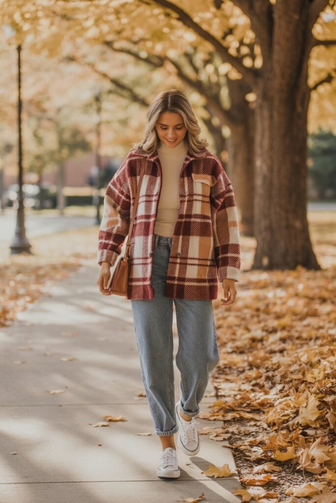 When the temperature drops and campus starts to smell like pumpkin spice lattes, it’s time to bring out the cozy layers. Combine a ribbed turtleneck with a plaid shacket (shirt-jacket hybrid) and your favorite straight-leg jeans. Add a beanie and your trusted white sneakers for a fall-perfect fit that’s both stylish and warm.