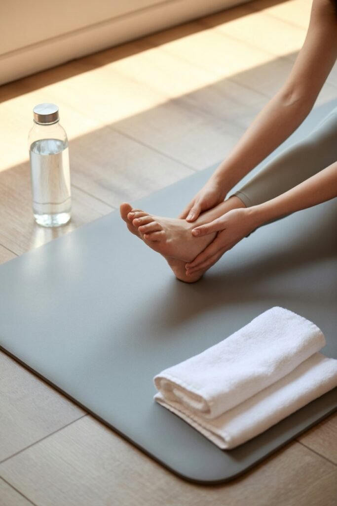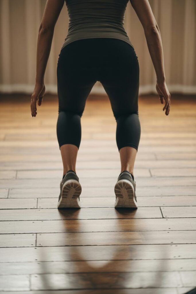- Calves: Press heel into the floor while leaning slightly forward against a wall.