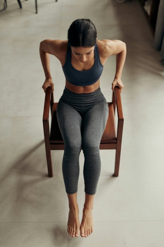 Sit on the edge of a chair or bench, hands gripping the edge with fingers facing forward. Slide your hips off the chair, bend your elbows, and lower your body. Push back up to the starting position.